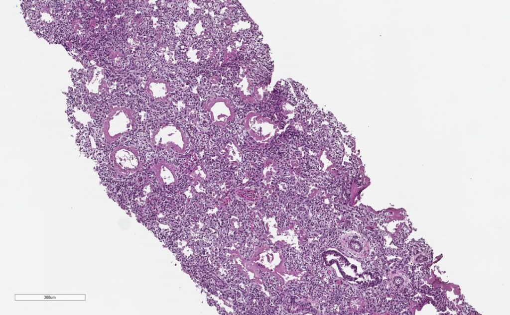 All CHAMPS laboratory results were negative for possible infectious causes of death in this case. Pathology from the baby’s right and left lungs showed severe hyaline membranes and mild interstitial inflammation, confirming the presence of RDS.